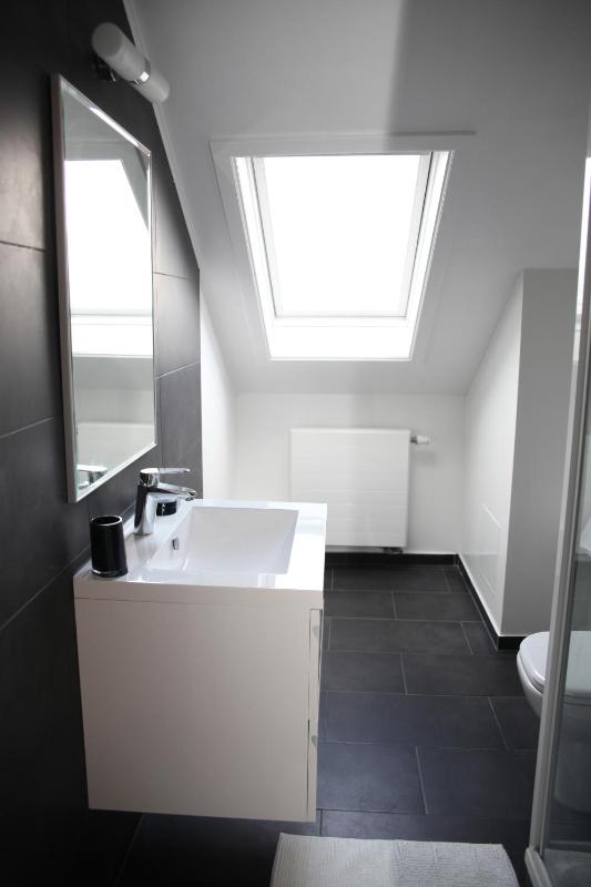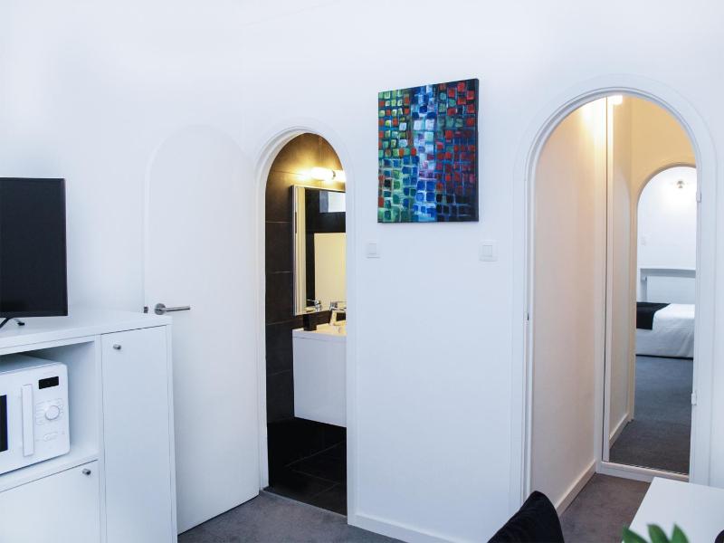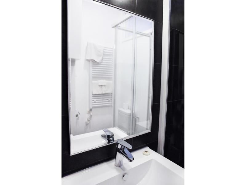 very clean bathroom and room equiped with modern furniture