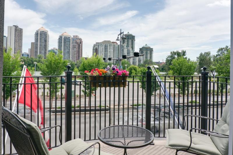 Luxury suite features a gas fireplace and a private balcony with panoramic views of downtown calgary and the bow river pathway. bathroom offers a separate rain shower and a large soaker tub. free wifi, complimentary newspaper, coffee, and bottled water are provided.