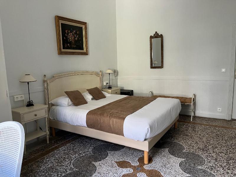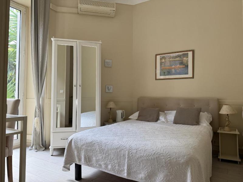 The hotel is in the first floor, with the private garden. The garden is charming and quiet, making it an ideal place to spend a hot afternoon. The hotel is a short walk away from the beach and the historic parts of Nice. The bed was very comfortable.