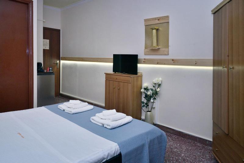 The block faces due south so has hot sun blaring straight at it nearly all day. Some rooms don’t have balconies and some do but living in either is a challenge as you’d have to draw the curtains and have the a/c on. Our room at the back was cooler but then you miss the view over Pl. Athinogora at the front. The tiny bathroom had 3 separate levels of little steps.