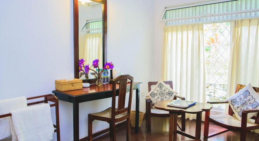 Beautiful location set in 10 acres of land. Super quiet you just hear the jungle noises. Gorgeous swimming pool. Old colonial style bungalow full of charm and antiques. Our bedroom was facing the front lawn spacious and charming. We had the SriLanka breakfast which was delicious and also had supper of traditional vegetarian ‘’curry and rice’ which was really so tasty.